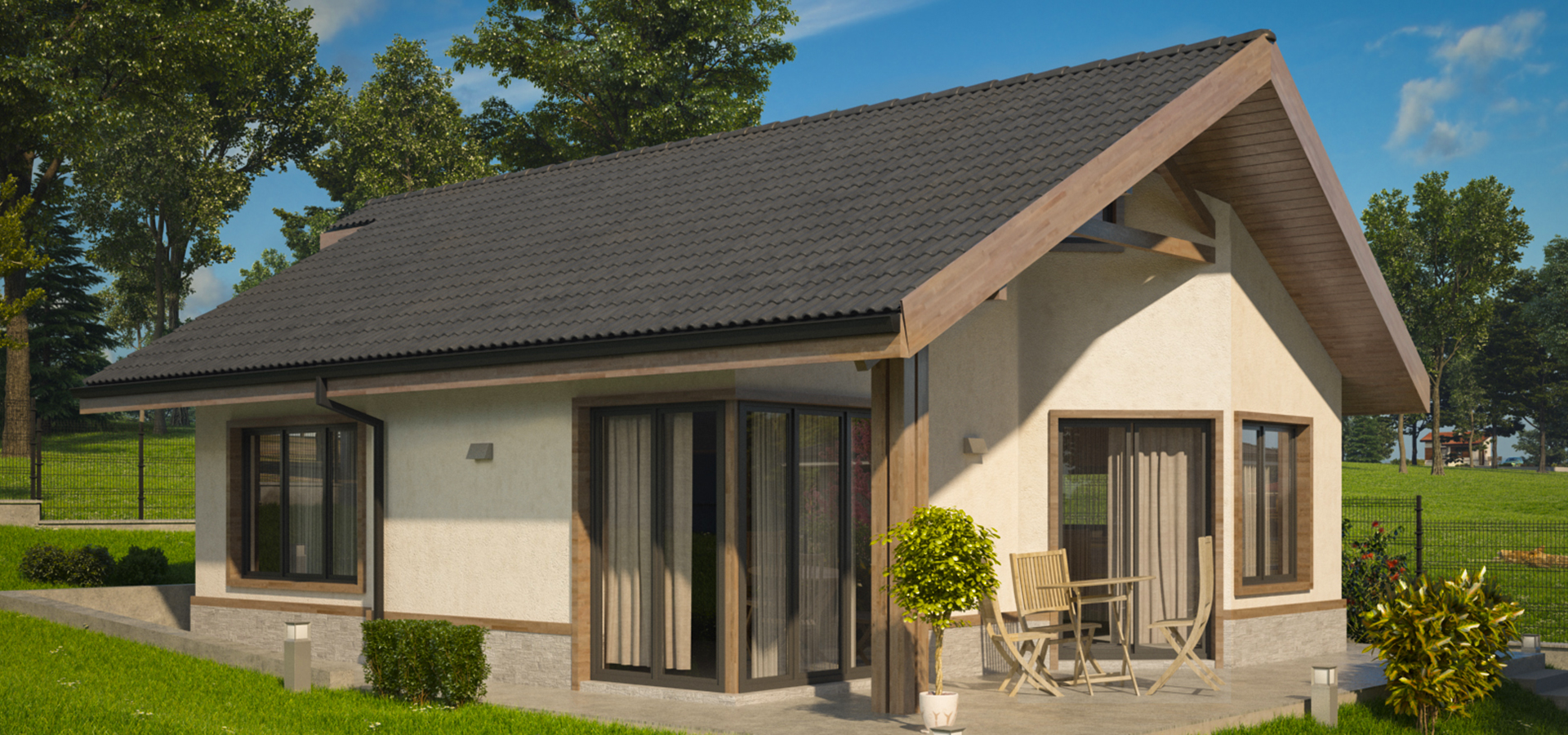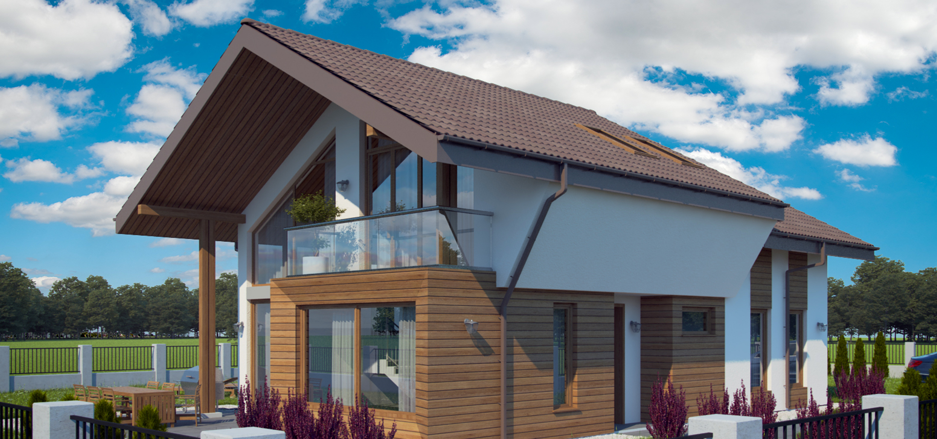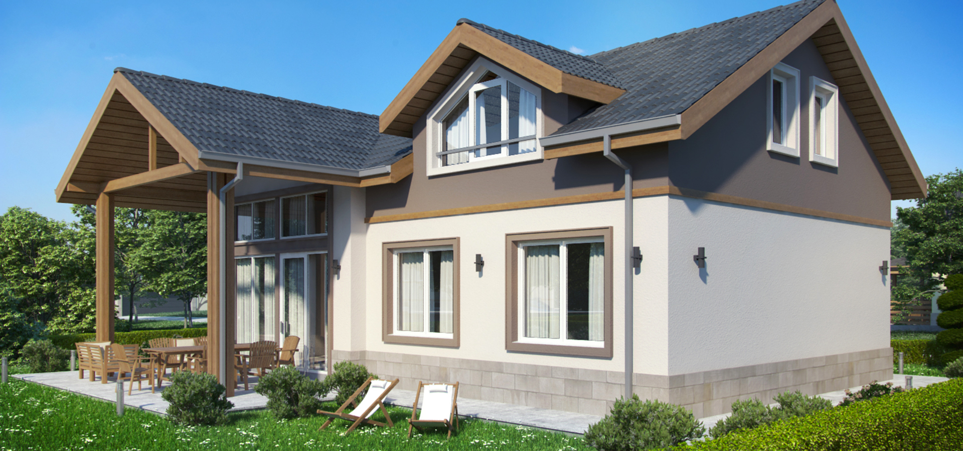 Към продуктите и услугите, които предлагаме при изпълнението на нашите къщи добавихме и оразмеряване, производство и изграждане на покривни конструкции с дървени ферми с ноктеви плочи, както и цялостни решения за покрив – покривни и коминни системи, покривни прозорци “Velux”.