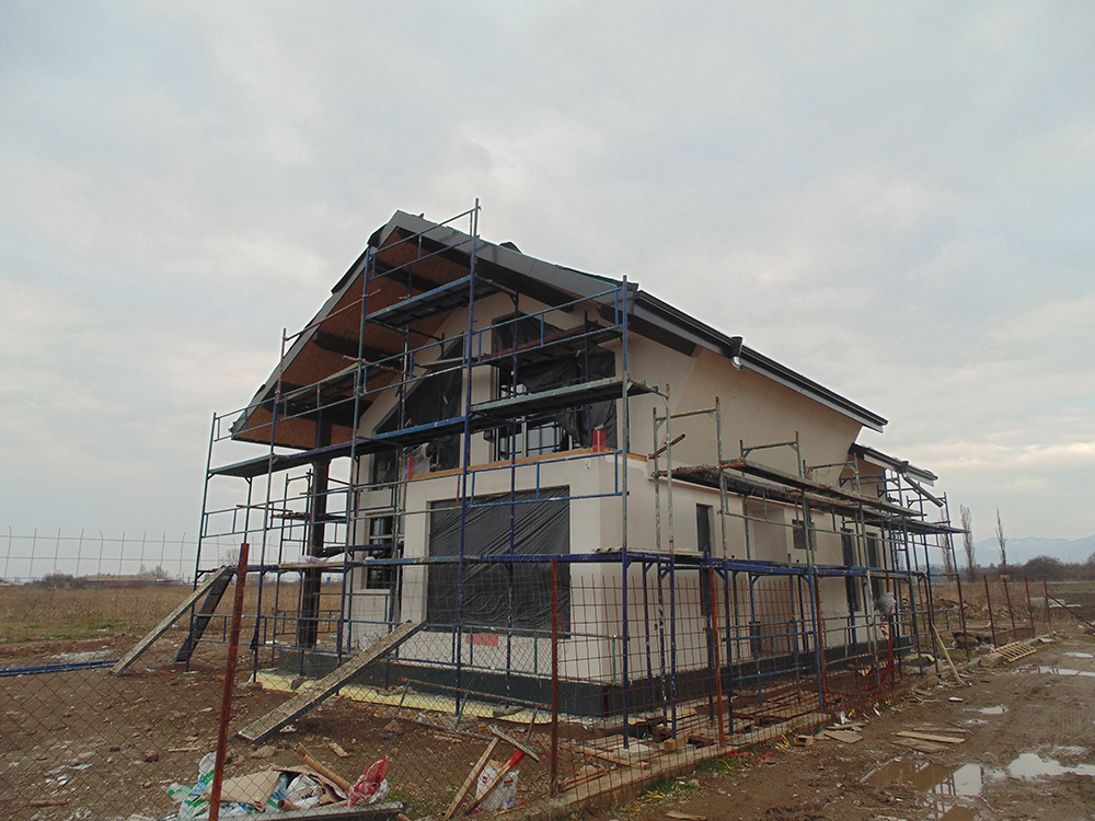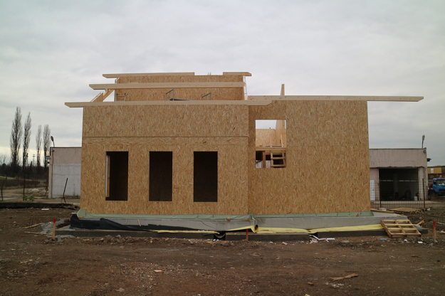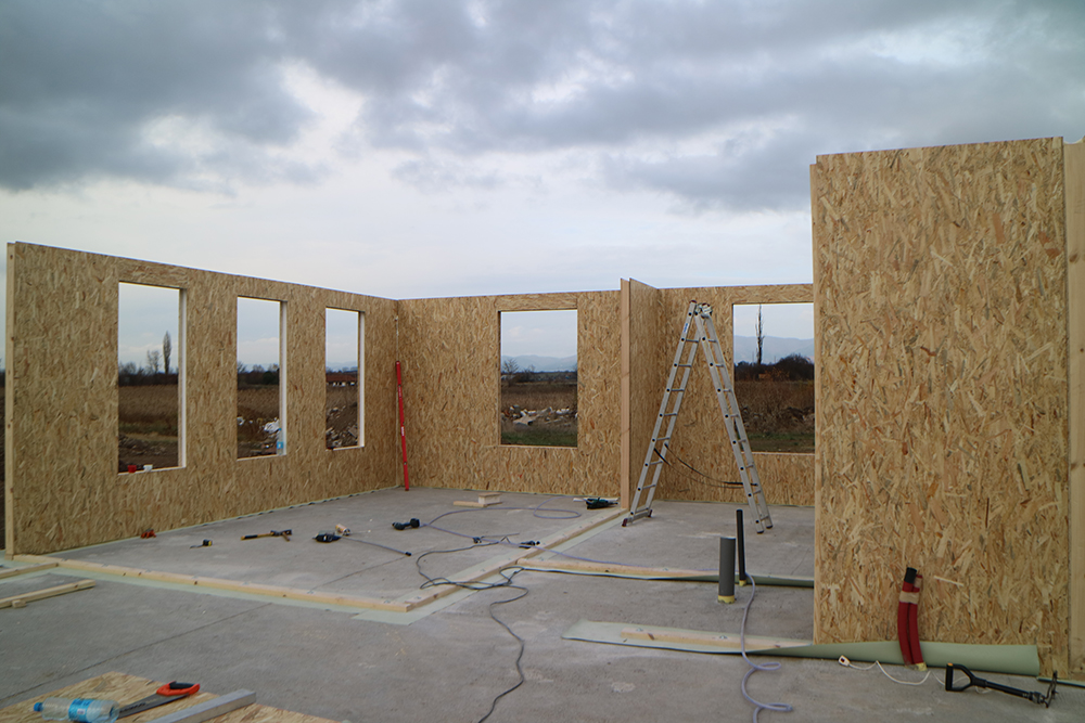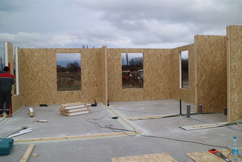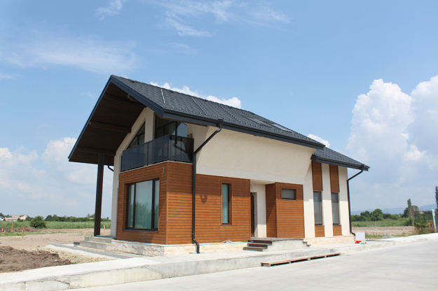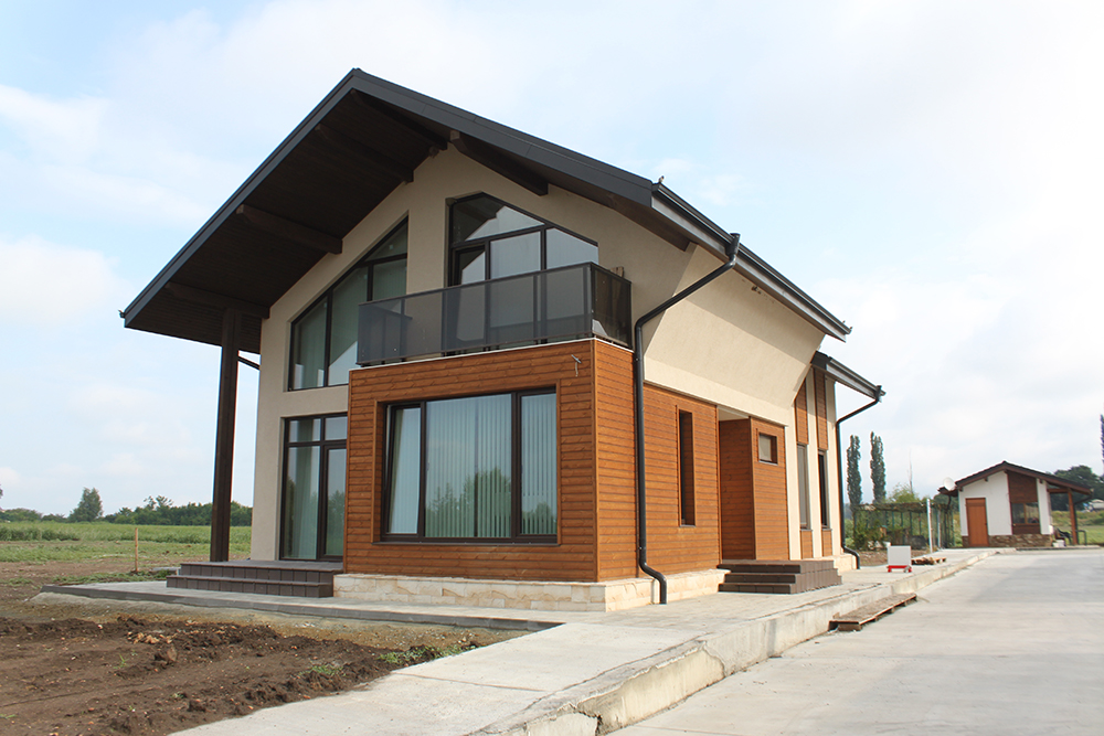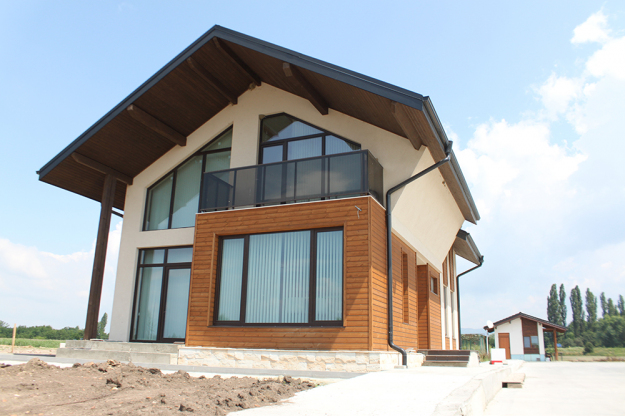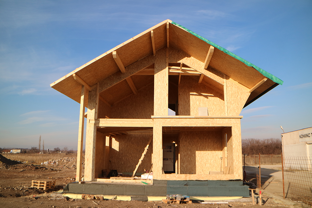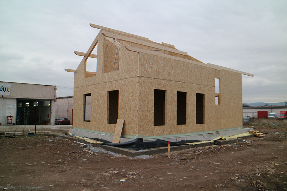 През 2016г. изградихме нискоенергийна мострена къща, разположена на няколко минути от гр. София, където посрещаме клиенти и партньори. Предназначението на къщата е да покаже истинските възможности на строителството с дървесина и комфортната среда на обитаване, в която работи екипа ни. Къщата е на две нива, с усвоено подпокривно пространство, в което сме постигнали максимален комфорт, който е осигурен с помощта на отлична топлоизолация, достатъчно естествена светлина и добра вентилация, благодарение на покривните прозорци Velux. Площ на първо ниво: 97м2 Площ на второ ниво: 98м2 Технология на изграждане: Дървена носеща конструкция със структурни изолационни панели. Фасадна топлоизолационна система: Интегрирана топлоизолационна система „Баумит“ със 100мм EPS и структурна силиконова мазилка; декоративна облицовка от термо дърво, обработено с масло.
