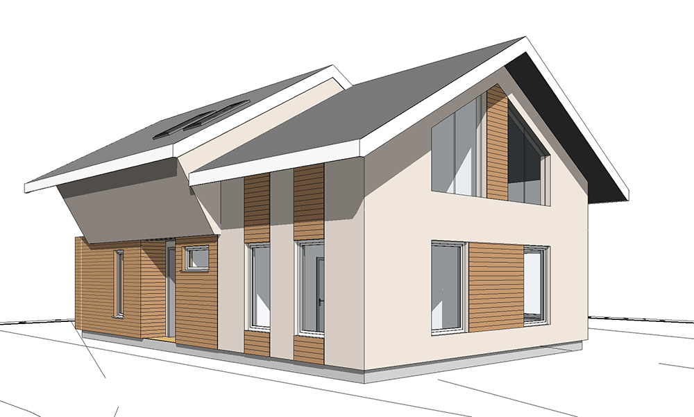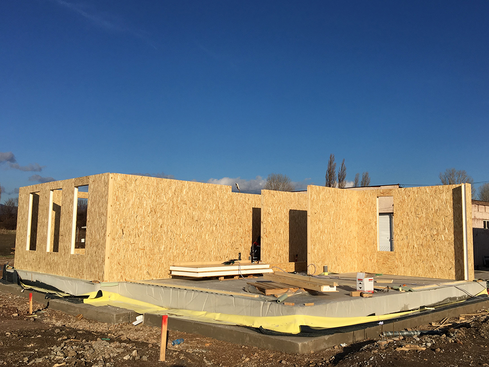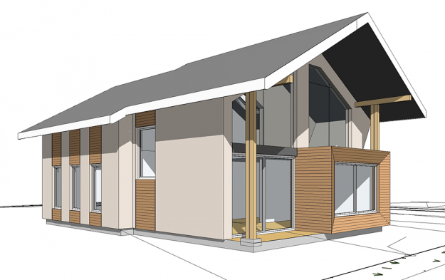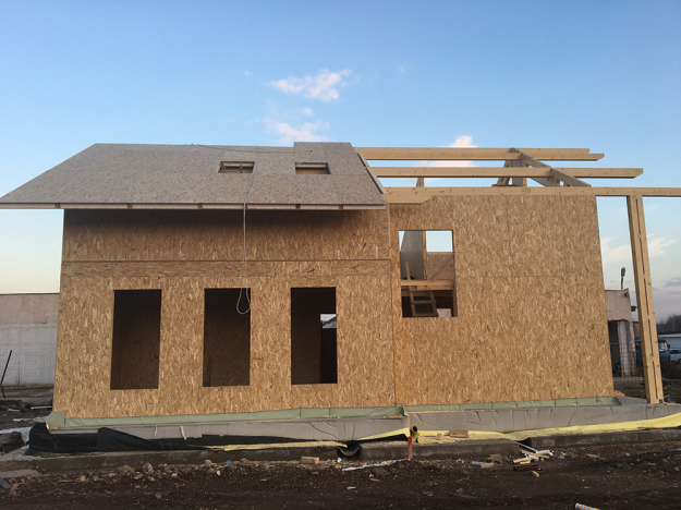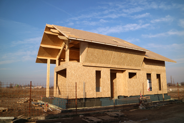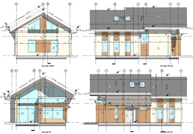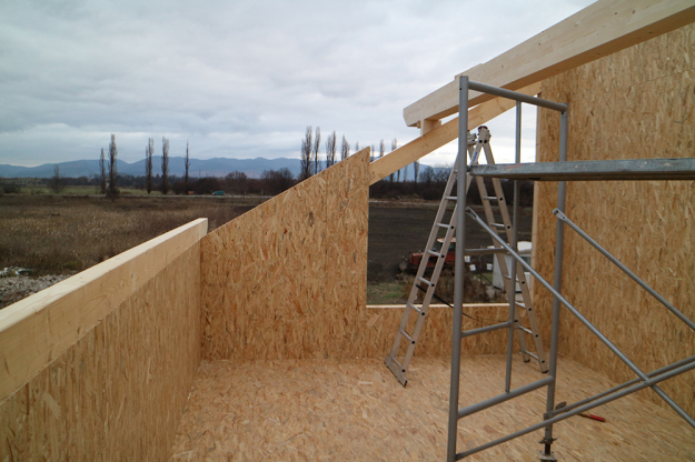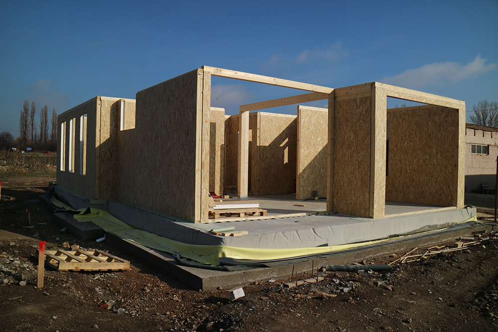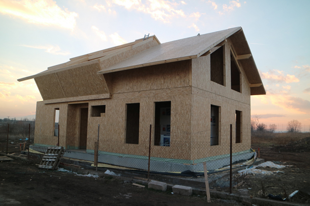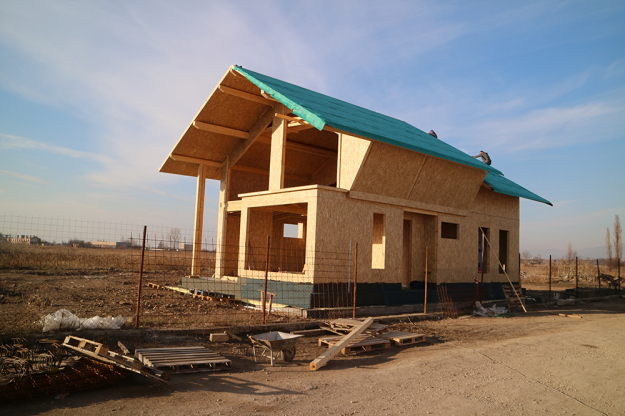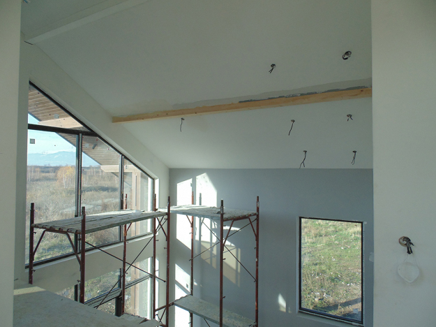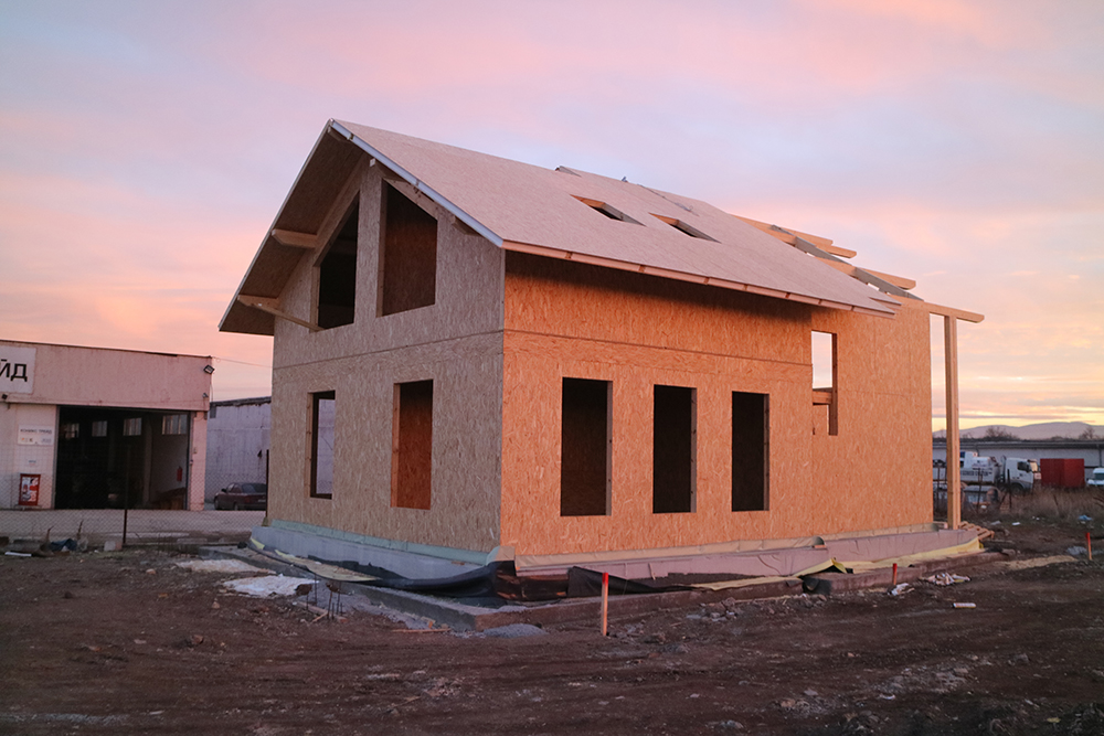 През 2016г. изградихме нискоенергийна мострена къща, разположена на няколко минути от гр. София, където посрещаме клиенти и партньори. Предназначението на къщата е да покаже истинските възможности на строителството с дървесина и комфортната среда на обитаване, в която работи екипа ни. Къщата е на две нива, с усвоено подпокривно пространство, в което сме постигнали максимален комфорт, който е осигурен с помощта на отлична топлоизолация, достатъчно естествена светлина и добра вентилация, благодарение на покривните прозорци Velux. Площ на първо ниво: 97м2 Площ на второ ниво: 98м2 Технология на изграждане: Дървена носеща конструкция със структурни изолационни панели. Фасадна топлоизолационна система: Интегрирана топлоизолационна система „Баумит“ със 100мм EPS и структурна силиконова мазилка; декоративна облицовка от термо дърво, обработено с масло.