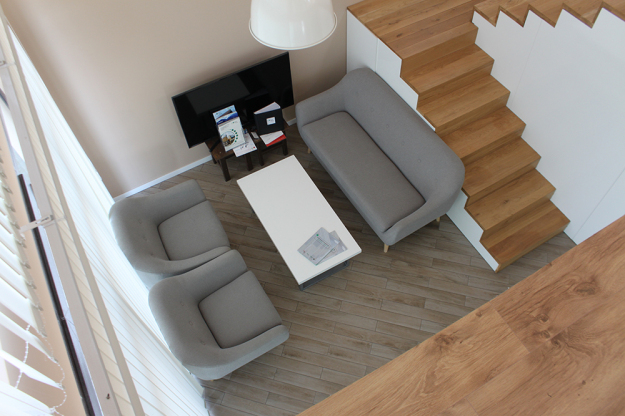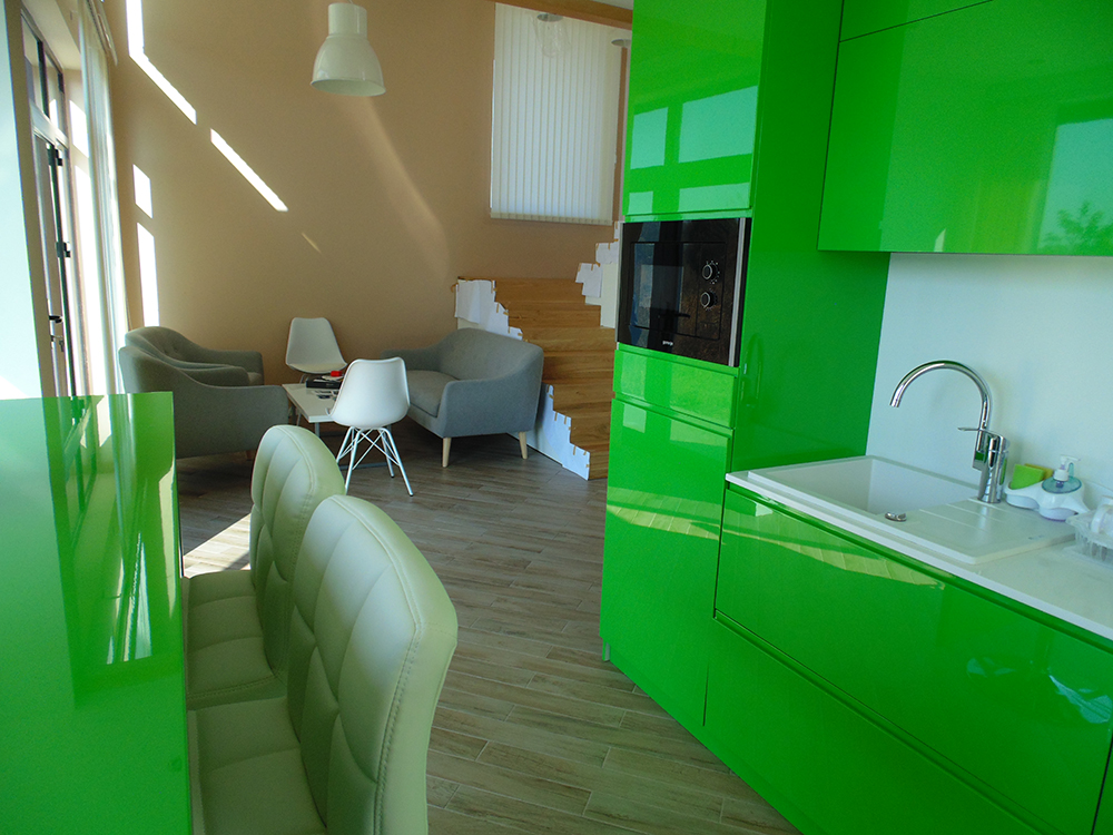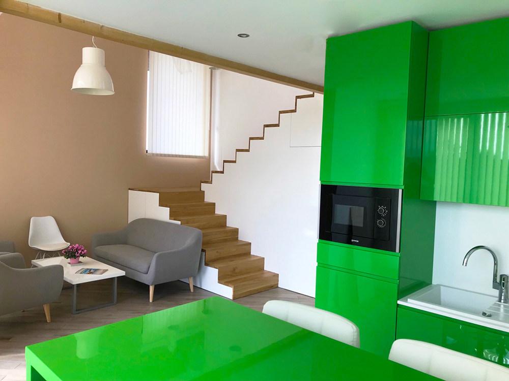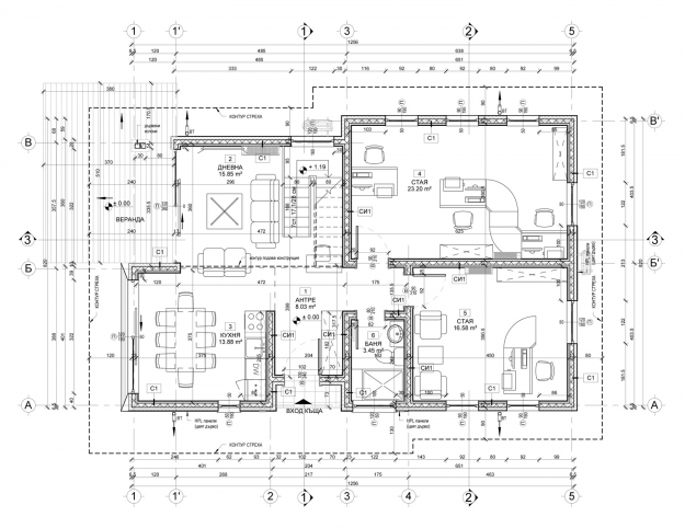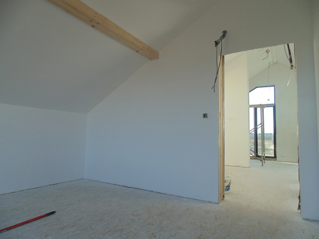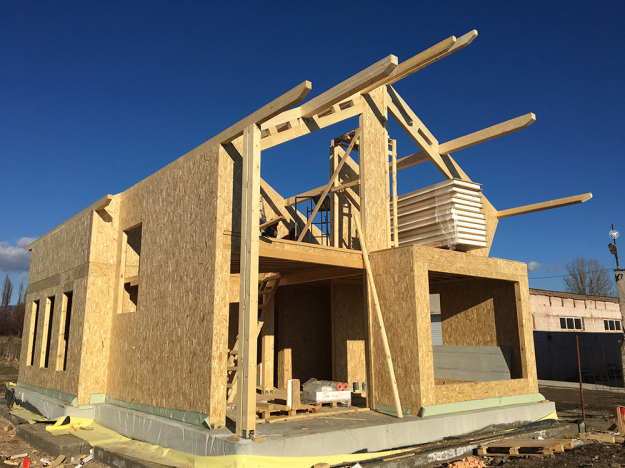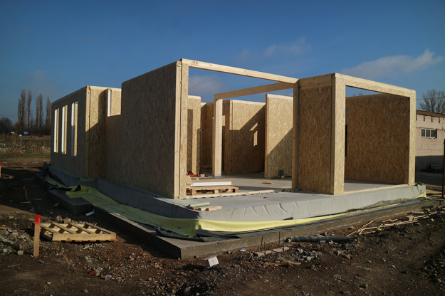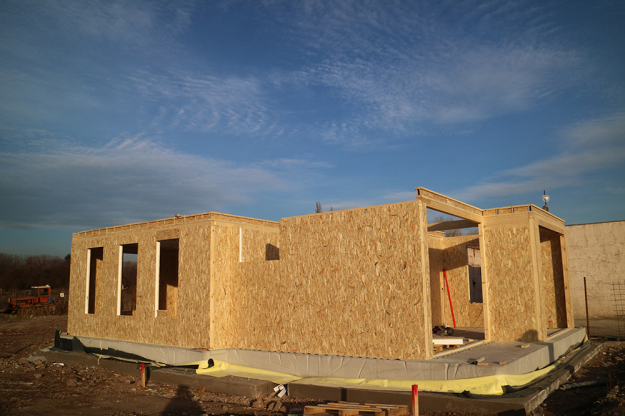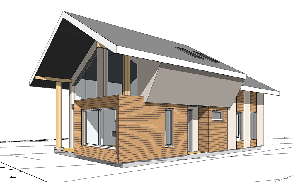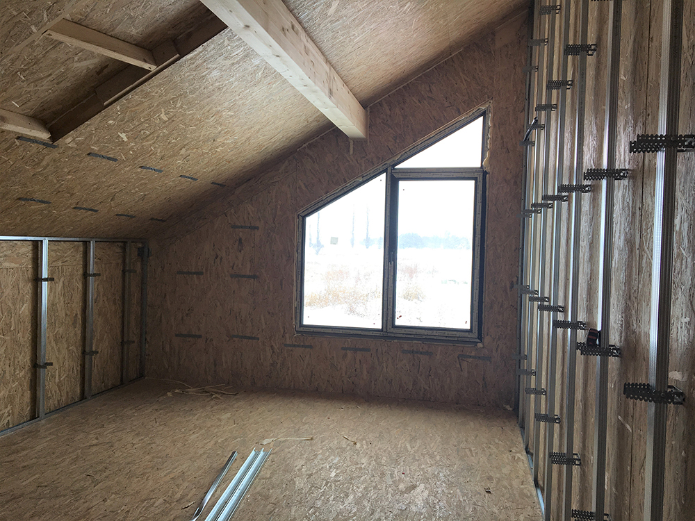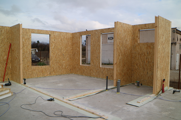 През 2016г. изградихме нискоенергийна мострена къща, разположена на няколко минути от гр. София, където посрещаме клиенти и партньори. Предназначението на къщата е да покаже истинските възможности на строителството с дървесина и комфортната среда на обитаване, в която работи екипа ни. Къщата е на две нива, с усвоено подпокривно пространство, в което сме постигнали максимален комфорт, който е осигурен с помощта на отлична топлоизолация, достатъчно естествена светлина и добра вентилация, благодарение на покривните прозорци Velux. Площ на първо ниво: 97м2 Площ на второ ниво: 98м2 Технология на изграждане: Дървена носеща конструкция със структурни изолационни панели. Фасадна топлоизолационна система: Интегрирана топлоизолационна система „Баумит“ със 100мм EPS и структурна силиконова мазилка; декоративна облицовка от термо дърво, обработено с масло.