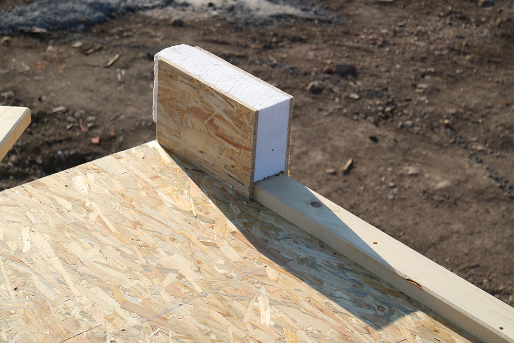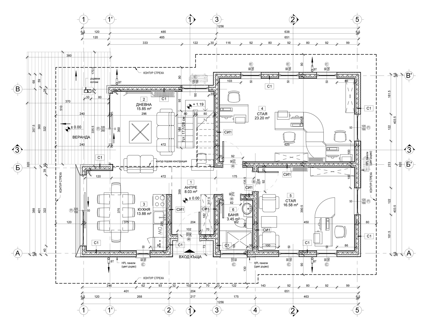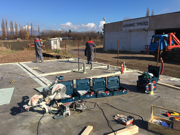Покривна конструкция със структурни изолационни панели: Топлоизолация от EPS с дебелина 100мм, λ=0.33W/mK и топлоизолационна каменна вата с дебелина 150мм, λ=0.037W/mK.
