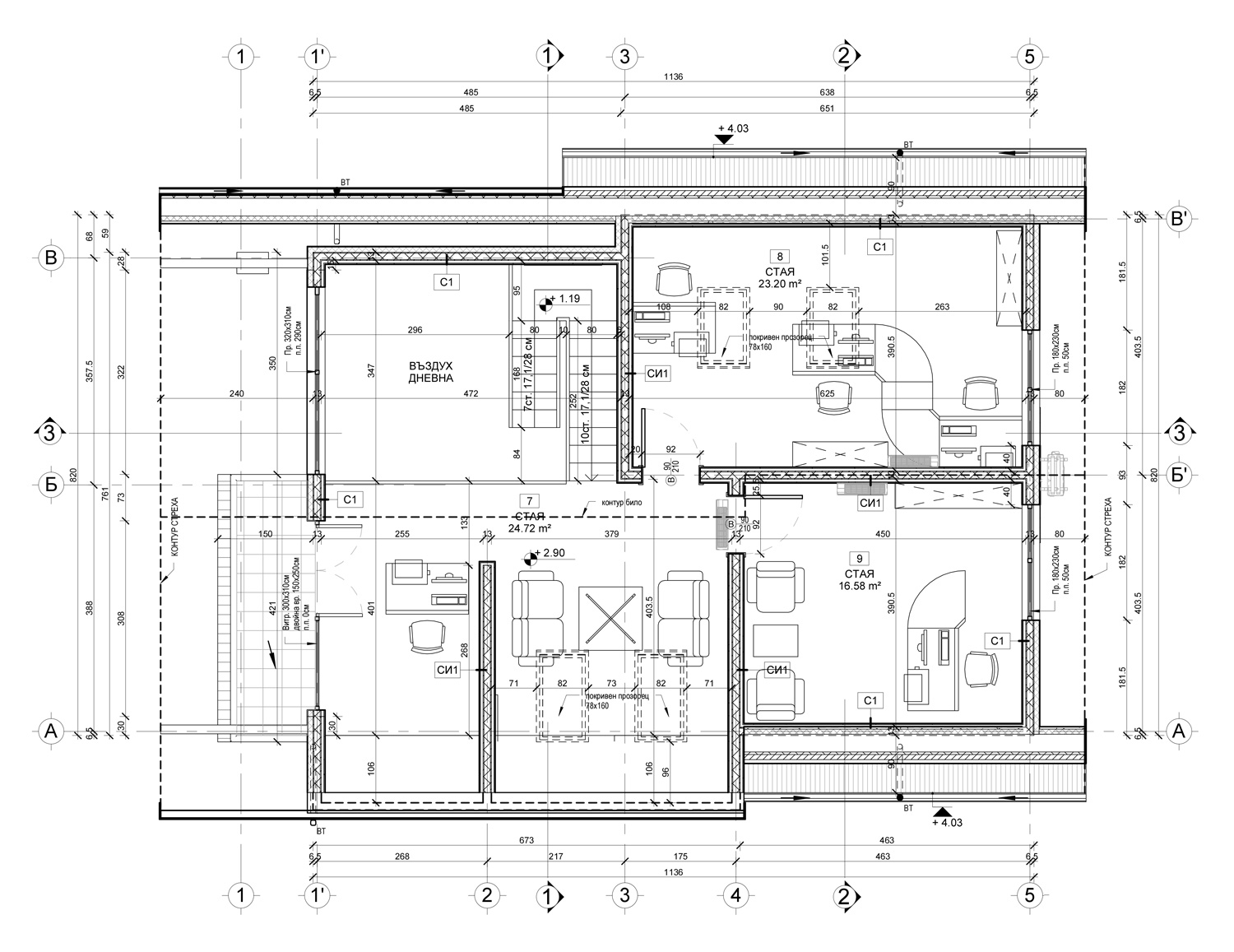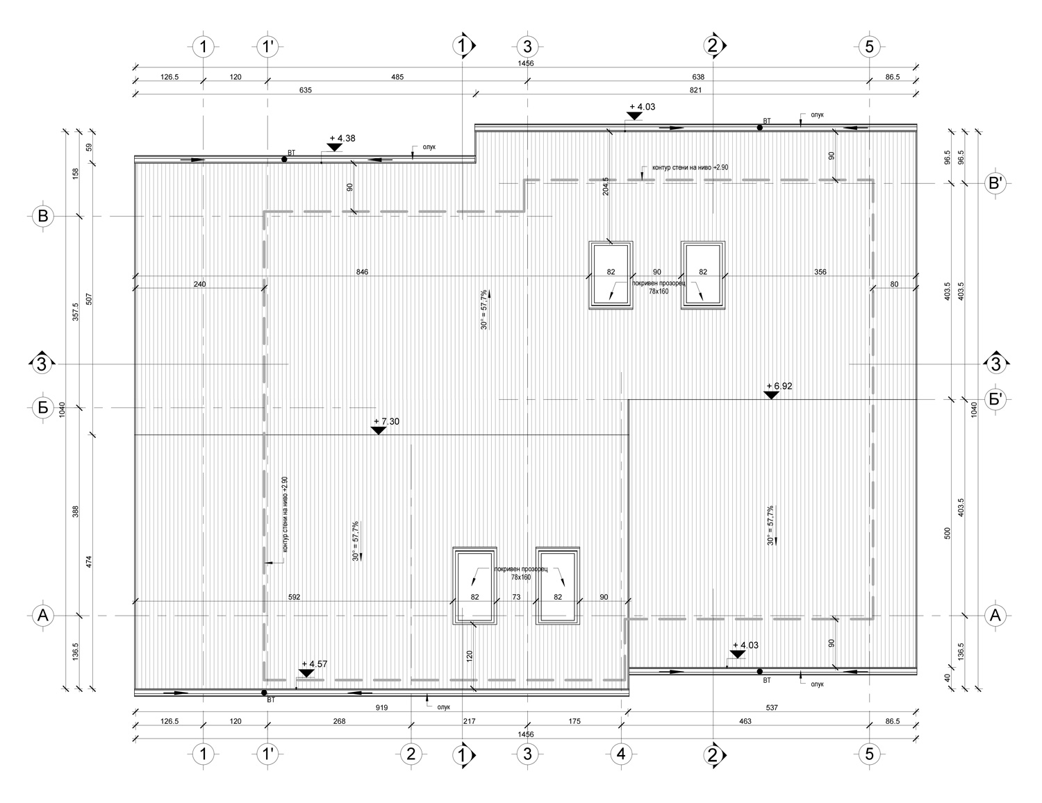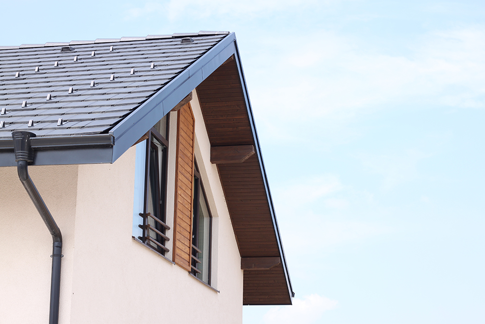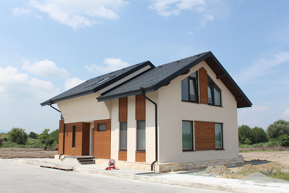 Покривна система: „Брамак“ – Паропропускливо хидроизолационно фолио Pro Plus Resistant, двойна дървена скара, плоска керемида “Tectura Protector”, цвят антрацит, безшевни улуци и обшивки от ламарина.